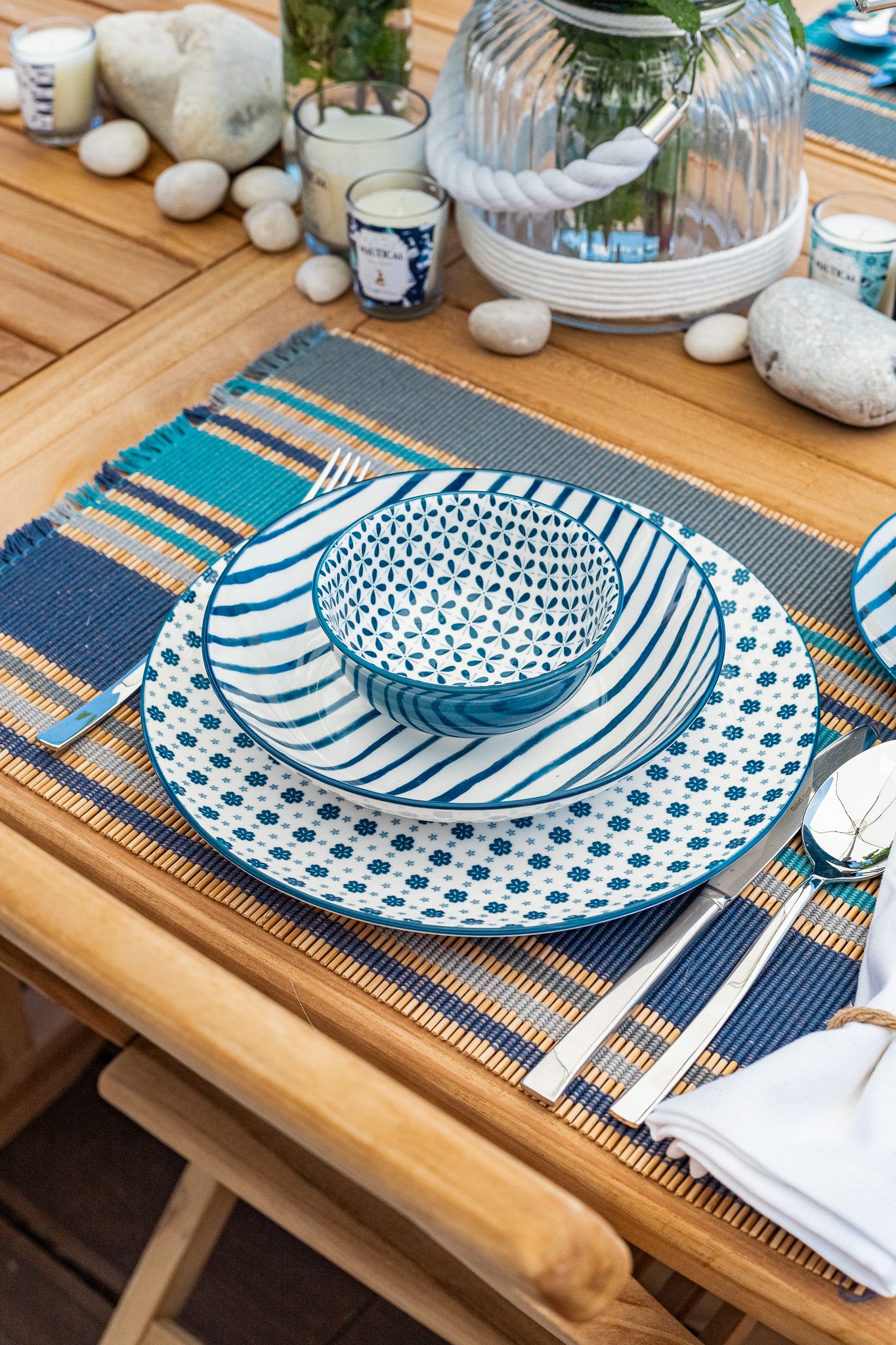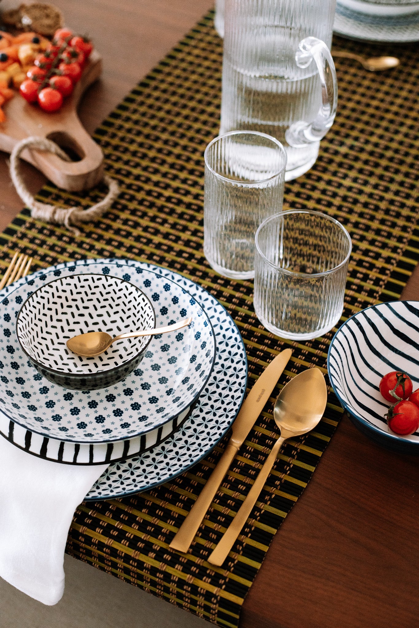 Inspirada na estética oriental e na elegância do design contemporâneo, a Coleção ASIA combina azul e preto sobre branco em padrões geométricos pensados para serem cruzados, criando composições sofisticadas e versáteis.
