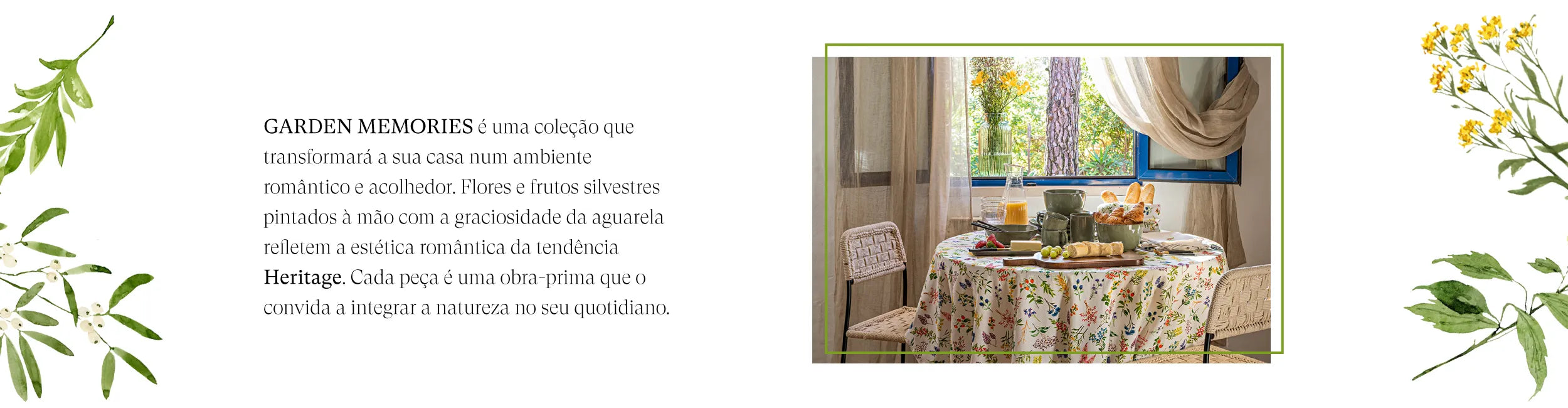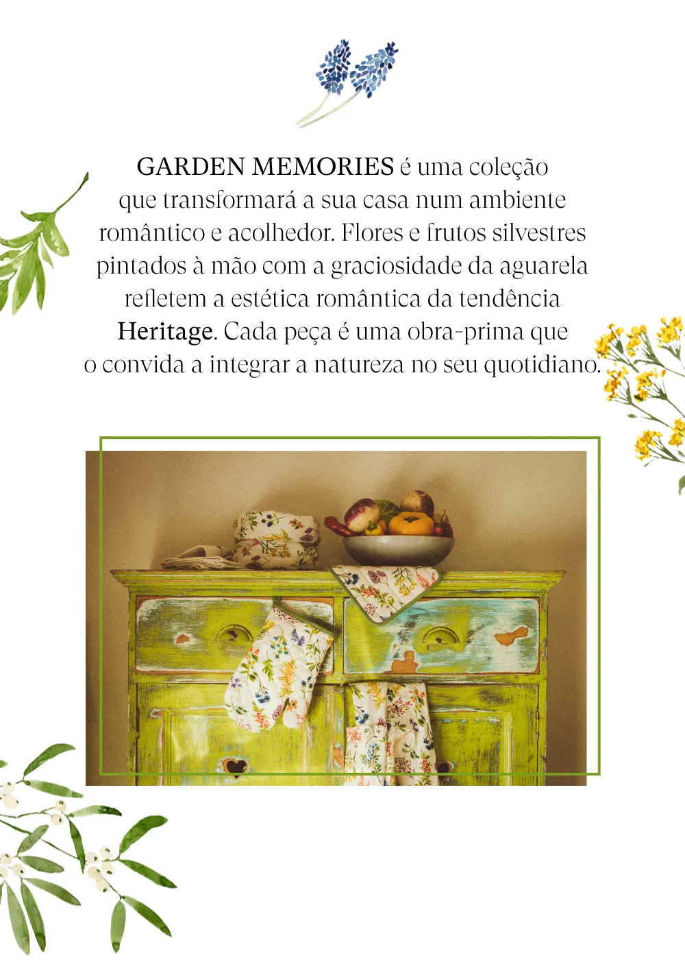 GARDEN MEMORIES é uma coleção que transformará a sua casa num ambiente romântico e acolhedor. Flores e frutos silvestres pintados à mão com a graciosidade da aguarelarelletem a estetica romantica da tendenciaHeritage. Cada peça é uma obra-prima que o convida a integrar a natureza no seu quotidiano.