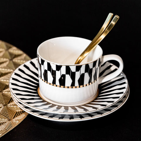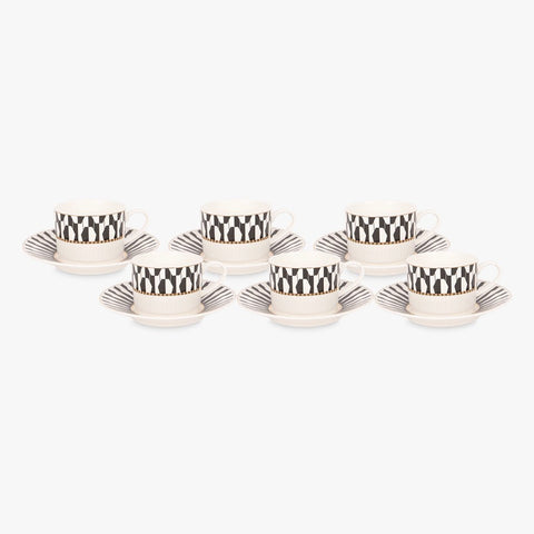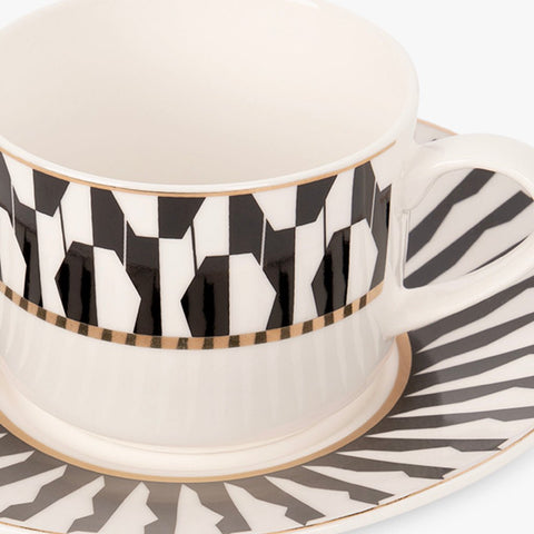 The Black Cat collection is a bold fusion of urban sophistication and Art Deco elegance. Its design plays with geometric contrasts between black and white, positive and negative, where the silhouette of a cat is subtly revealed, almost hidden, creating an intriguing visual effect. The restrained palette, with touches of metallic gold, reinforces the glamour and modernity of each piece. A porcelain tableware set, consisting of two place settings, a dinner plate, a dessert plate, a soup plate, two bowls, a salad bowl, and tea and coffee cups in sets of 2 and 6 pieces.