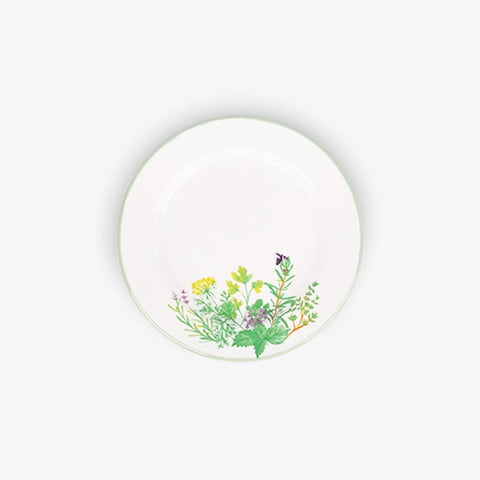The AROMATICS collection is inspired by the cottagecore theme. The original illustrations were painted in watercolour combining various aromatic herbs that give a country spirit to the service made in metal. Set the table outside, surrounded by flowers and enjoy a country atmosphere at your table. The collection consists of a metal service with a plate, dessert plate, bowl, pasta plate and two serving plates. Exterior size: D20x1,5cm; Interior size: D14x1,5cm.