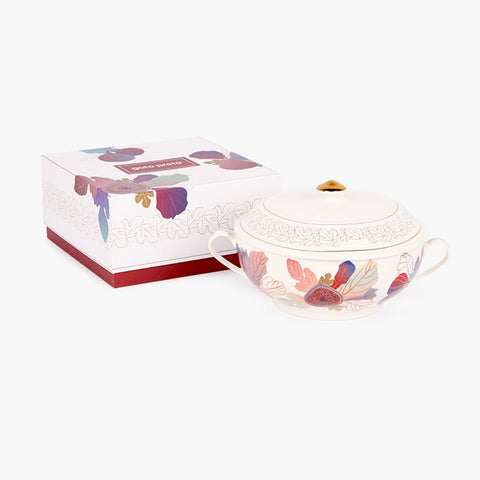 Because of this rich symbolism, our party service is inspired by its leaves and fruits, with digital illustrations rich in gradients of vibrant colors, resulting in surreal immersive gardens with metallic gold touches, bringing all the refinement that celebrations deserve.