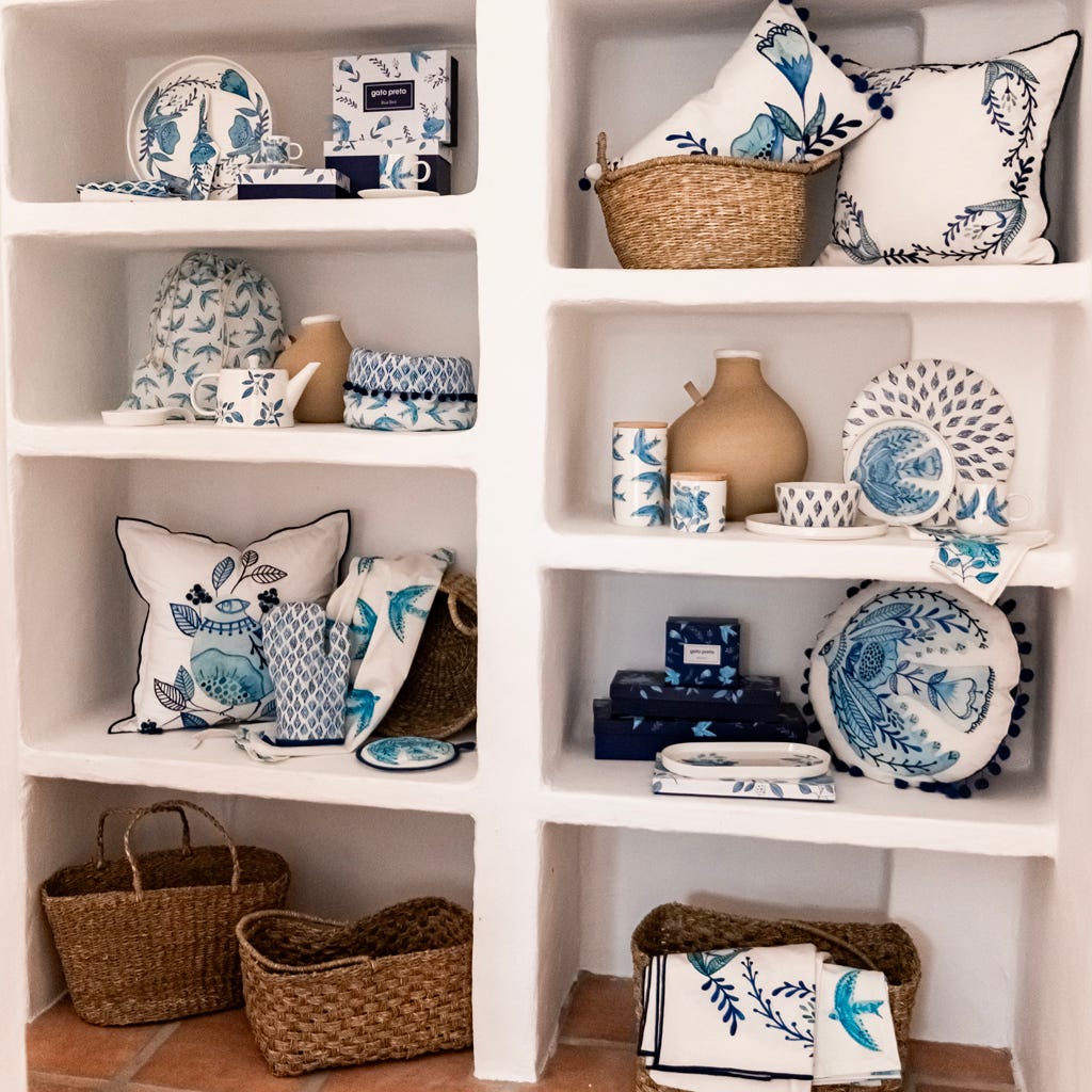 Uma simbiose entre pássaros e vegetação oriunda das tapeçarias de Castelo Branco em conjunto com o azul profundo dos azulejos do séc. XVIII é pintada originalmente à mão com a técnica de aguarela, resultando num elegante serviço.
