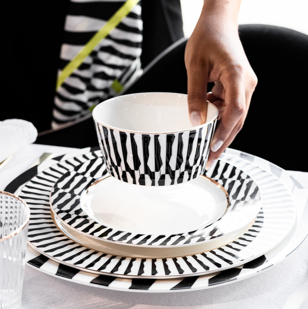 A coleção Black Cat é uma fusão ousada entre a sofisticação urbana e a elegância Art Deco. O seu design joga com contrastes geométricos entre o preto e o branco, positivo e negativo, onde a silhueta de um gato se revela subtilmente, quase escondida, criando um efeito visual intrigante. A paleta restrita, com toques de dourado metálico, reforça o glamour e a modernidade de cada peça. Um serviço de mesa em porcelana, composto por dois pratos marcadores, prato raso, prato de sobremesa, prato de sopa, duas taças, saladeira, e chávenas de chá e café em conjuntos de 2 e de 6 peças.