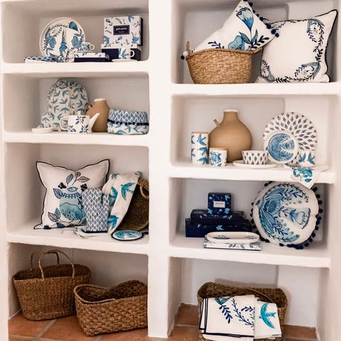 Una simbiosis entre pájaros y vegetación originaria de los tapices de Castelo Branco junto con el azul profundo de los azulejos del siglo XVIII está pintada originalmente a mano con la técnica de acuarela, resultando en un elegante servicio.