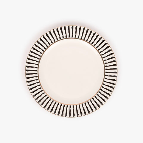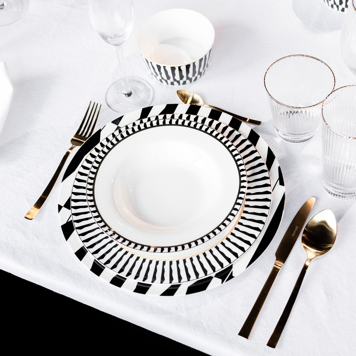 A coleção Black Cat é uma fusão ousada entre a sofisticação urbana e a elegância Art Deco. O seu design joga com contrastes geométricos entre o preto e o branco, positivo e negativo, onde a silhueta de um gato se revela subtilmente, quase escondida, criando um efeito visual intrigante. A paleta restrita, com toques de dourado metálico, reforça o glamour e a modernidade de cada peça. Um serviço de mesa em porcelana, composto por dois pratos marcadores, prato raso, prato de sobremesa, prato de sopa, duas taças, saladeira, e chávenas de chá e café em conjuntos de 2 e de 6 peças.