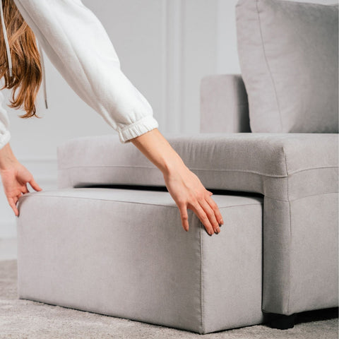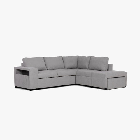 Sofá-cama de canto de 3 lugares com dois pufes adicionais, 2 espaços de arrumação e uma pequena prateleira.