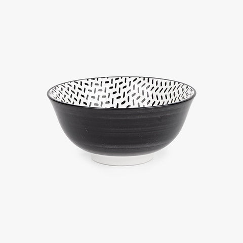 Producido en Porcelana New Bone China, está compuesto por cuatro patrones diferentes en dos colores, Negro y Azul, en plato llano, plato de postre, plato de sopa y dos copas.