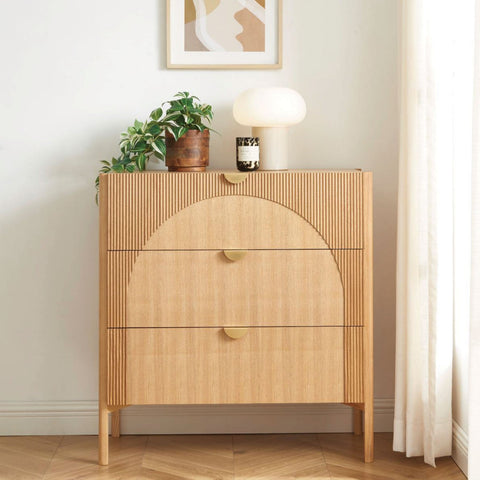 Esthétique méditerranéenne : formes arrondies, façades avec arcs sculptés et textures naturelles qui évoquent des environnements chaleureux et sophistiqués. Matériaux de qualité : fabriquée en MDF haute résistance, avec finition en mélamine et revêtement en placage de frêne, garantissant durabilité et légèreté visuelle. Détails distinctifs : poignées métalliques dorées et éléments en paille ajoutent une touche artisanale et contemporaine.