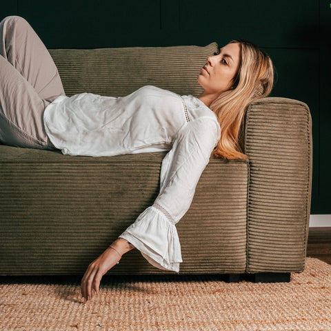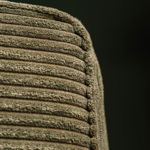 Les assises larges et les coussins de dossier amovibles offrent un confort enveloppant, idéal pour les moments de repos, de convivialité ou de détente prolongée. Le tissu côtelé renforce la sensation de cocooning et ajoute de la texture à l’ensemble, rehaussant le caractère décoratif du canapé.