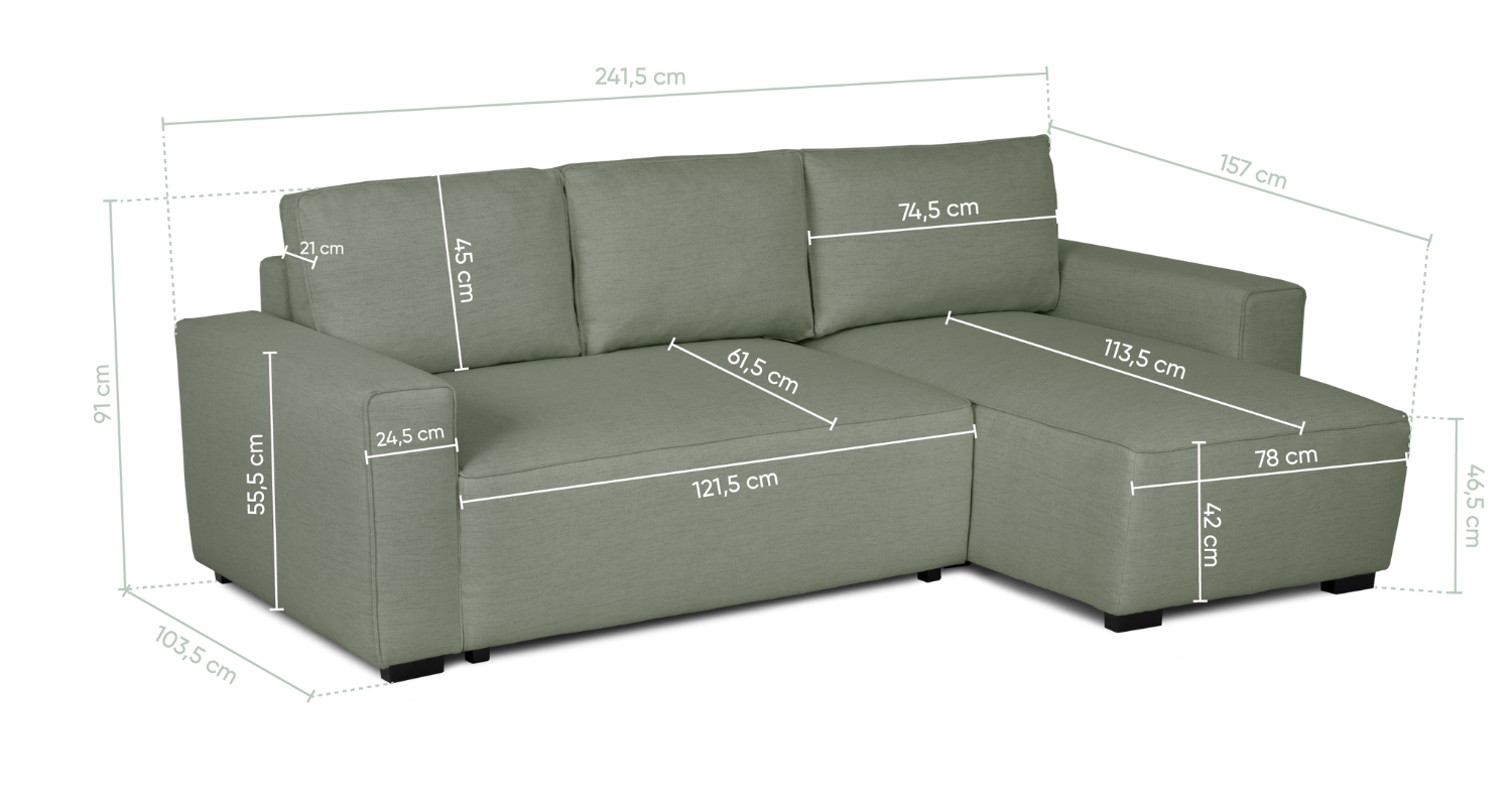 Disponible en vert, beige et gris, le canapé-lit JADE s’intègre facilement dans différents styles de décoration, s’affirmant comme une solution complète pour ceux qui recherchent un canapé avec rangement, méridienne et fonction lit dans un seul modèle.