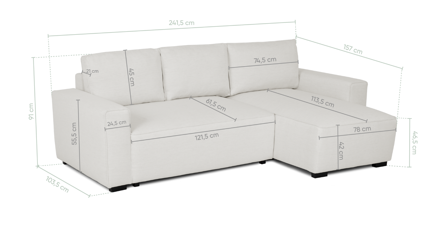 Disponible en vert, beige et gris, le canapé-lit JADE s’intègre facilement dans différents styles de décoration, s’affirmant comme une solution complète pour ceux qui recherchent un canapé avec rangement, méridienne et fonction lit dans un seul modèle.