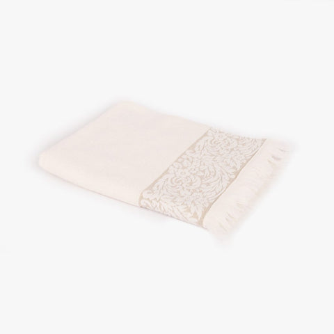 Serviette de bain en coton jacquard avec ourlet fleuri MURANO. Un incontournable de Gato Preto, parfait pour apporter une touche de style et de confort à votre espace avec originalité et charme.