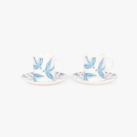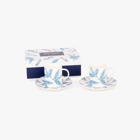 Uma simbiose entre pássaros e vegetação oriunda das tapeçarias de Castelo Branco em conjunto com o azul profundo dos azulejos do séc. XVIII é pintada originalmente à mão com a técnica de aguarela, resultando num elegante serviço.