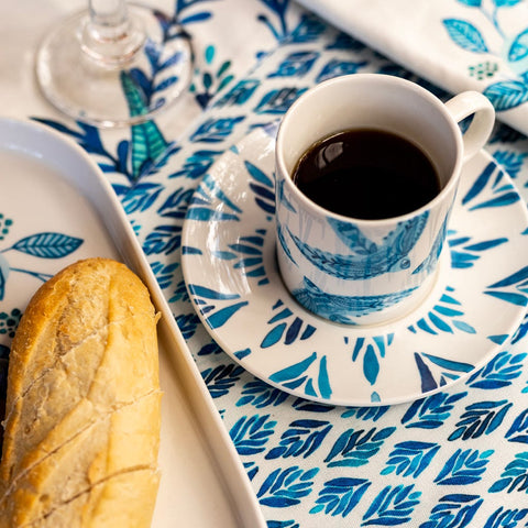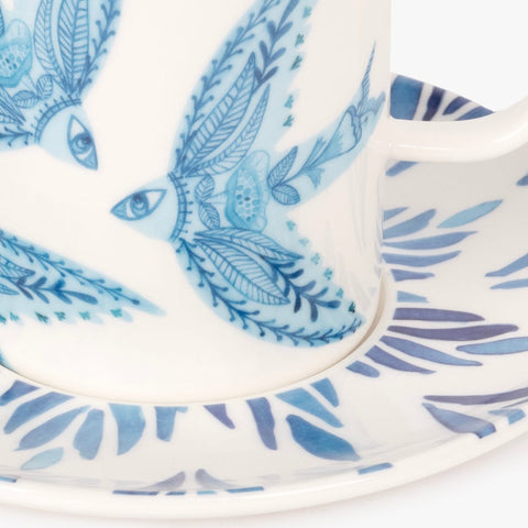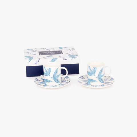 Uma simbiose entre pássaros e vegetação oriunda das tapeçarias de Castelo Branco em conjunto com o azul profundo dos azulejos do séc. XVIII é pintada originalmente à mão com a técnica de aquarela, resultando num elegante serviço.