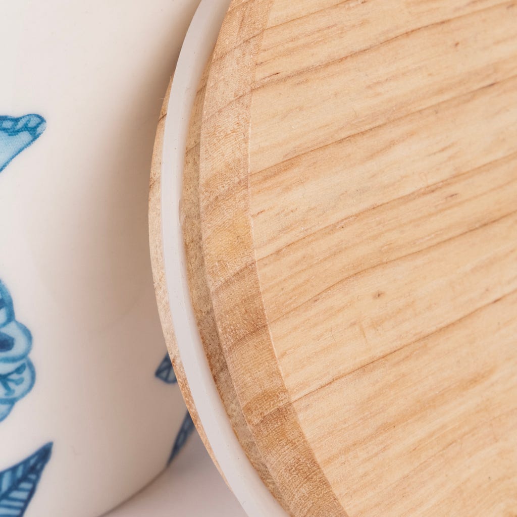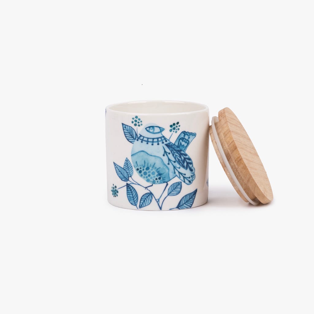 Uma simbiose entre pássaros e vegetação oriunda das tapeçarias de Castelo Branco em conjunto com o azul profundo dos azulejos do séc. XVIII é pintada originalmente à mão com a técnica de aguarela, resultando num elegante serviço.