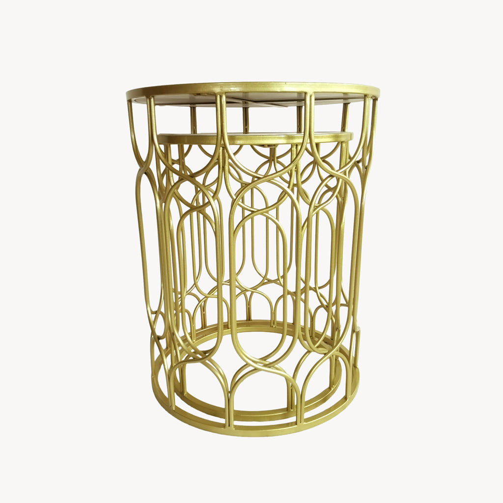 Conjunto de 2 mesas redondas com estrutura em favo dourado: traz um toque arquitetonico com a sua base em colmeia metálica, que alia transparência e riqueza visual, reforçando a sofisticação do mármore no tampo.