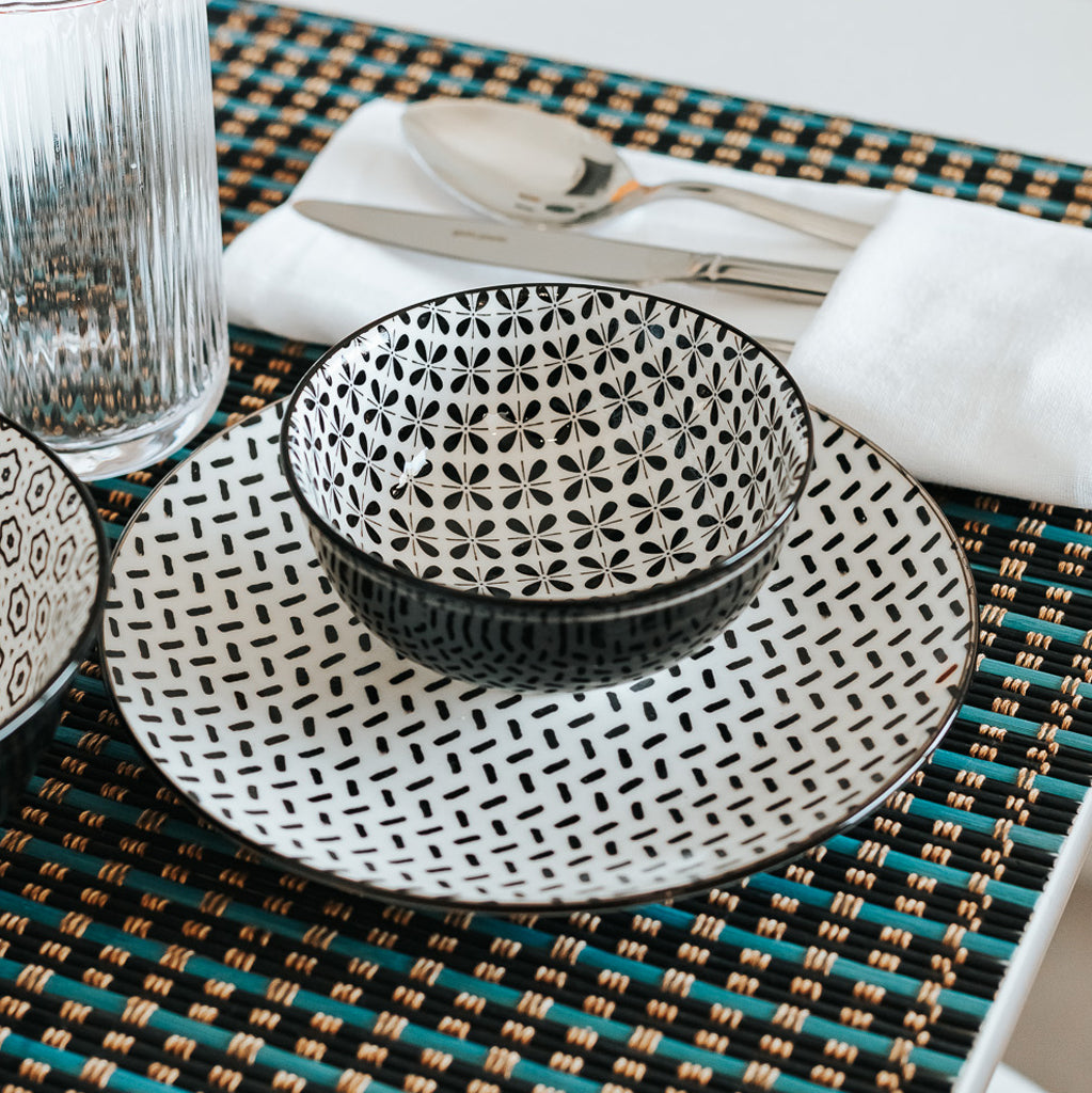 Inspirado na estética oriental e na elegância do design contemporâneo, o Serviço ASIA combina azul e preto sobre branco em padrões geométricos pensados para serem cruzados, criando composições sofisticadas e versáteis.