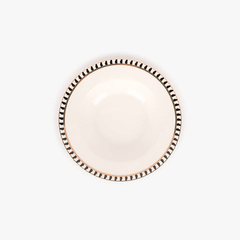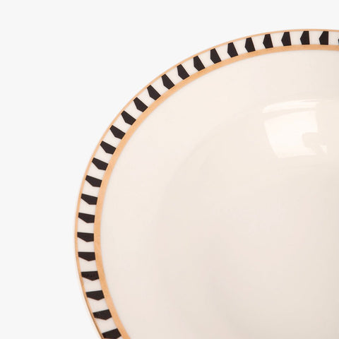 A coleção Black Cat é uma fusão ousada entre a sofisticação urbana e a elegância Art Deco. O seu design joga com contrastes geométricos entre o preto e o branco, positivo e negativo, onde a silhueta de um gato se revela subtilmente, quase escondida, criando um efeito visual intrigante. A paleta restrita, com toques de dourado metálico, reforça o glamour e a modernidade de cada peça. Um serviço de mesa em porcelana, composto por dois pratos marcadores, prato raso, prato de sobremesa, prato de sopa, duas taças, saladeira, e chávenas de chá e café em conjuntos de 2 e de 6 peças.