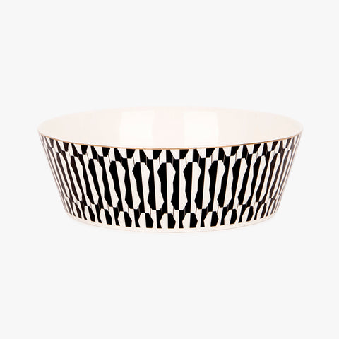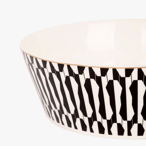 A coleção Black Cat é uma fusão ousada entre a sofisticação urbana e a elegância Art Deco. O seu design joga com contrastes geométricos entre o preto e o branco, positivo e negativo, onde a silhueta de um gato se revela subtilmente, quase escondida, criando um efeito visual intrigante. A paleta restrita, com toques de dourado metálico, reforça o glamour e a modernidade de cada peça. Um serviço de mesa em porcelana, composto por dois pratos marcadores, prato raso, prato de sobremesa, prato de sopa, duas taças, saladeira, e chávenas de chá e café em conjuntos de 2 e de 6 peças.