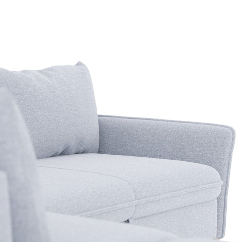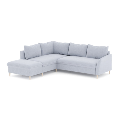 Sofá Aria de canto com 5 lugares e pés em madeira clara. Design leve e moderno no tom exclusivo Azul Céu, perfeito para um relaxamento profundo.