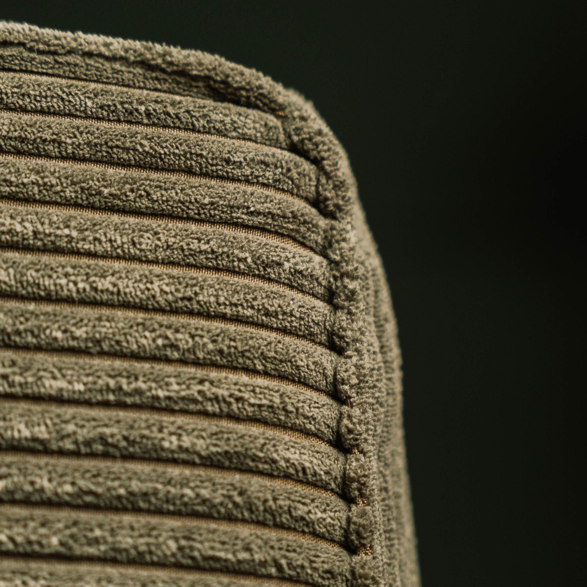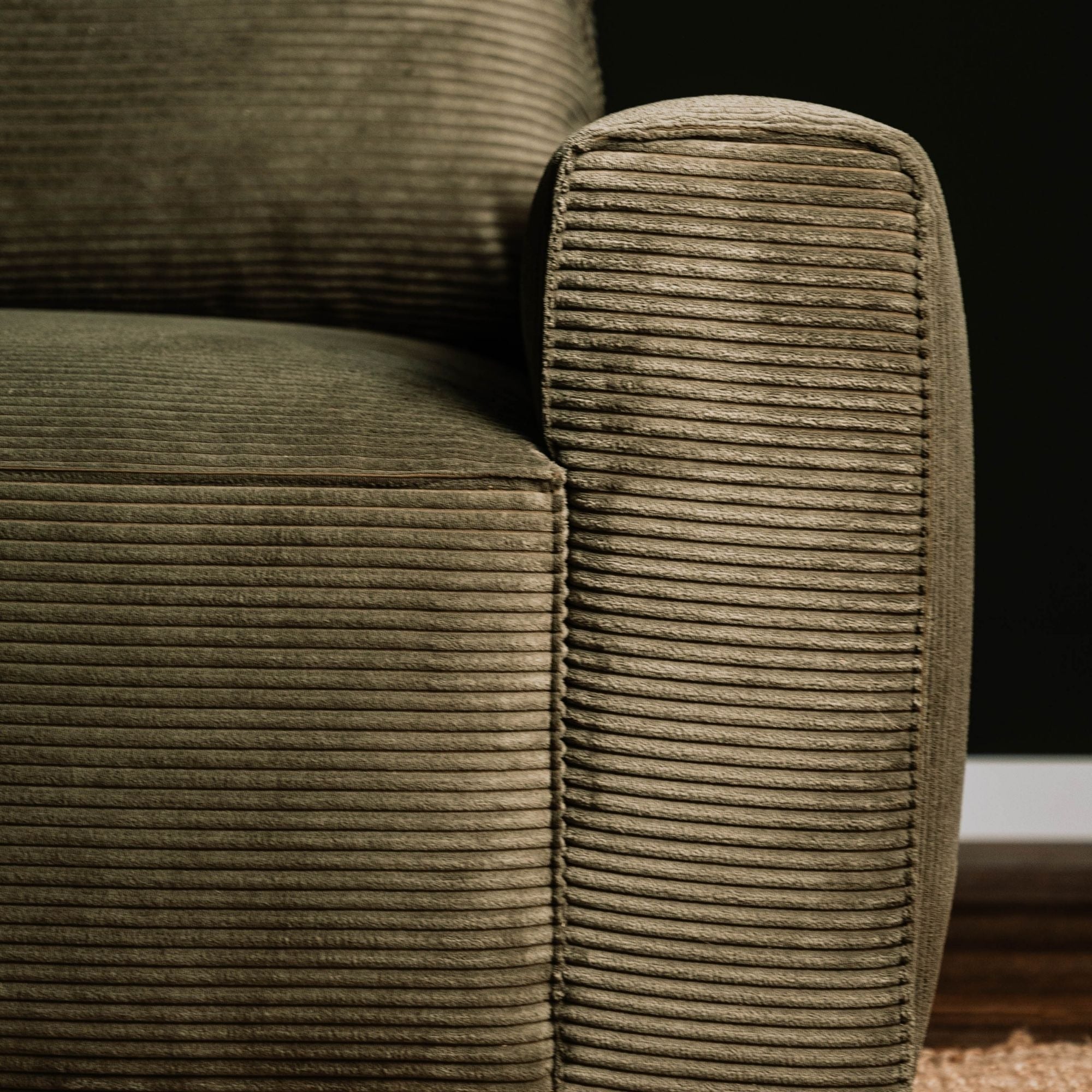 Os assentos amplos e as almofadas de encosto soltas proporcionam um conforto envolvente, ideal para momentos de descanso, convívio ou lazer prolongado. O tecido cotelê reforça a sensação de aconchego e acrescenta textura ao conjunto, elevando o carácter decorativo do sofá.