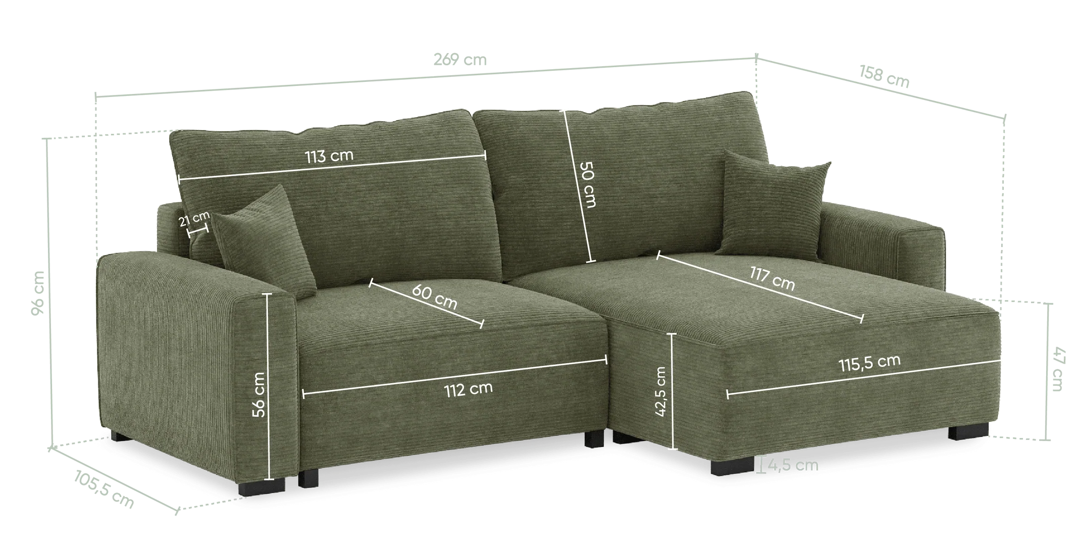 O sofá LAUREN é um sofá com chaise longue reversível e arrumação, concebido para oferecer máximo conforto e funcionalidade em ambientes contemporâneos. O seu design equilibrado, aliado ao revestimento em tecido cotelê, cria uma presença marcante e acolhedora na sala, tornando-o uma peça central no espaço.