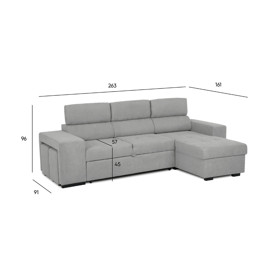 Medidas (cm): Sofá: 263×91×96 cm; Cama: 201×127 cm