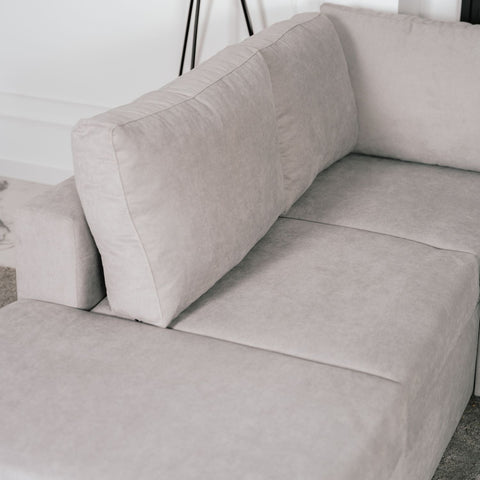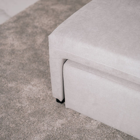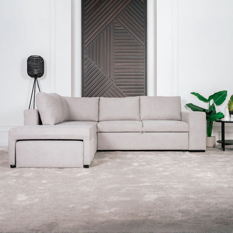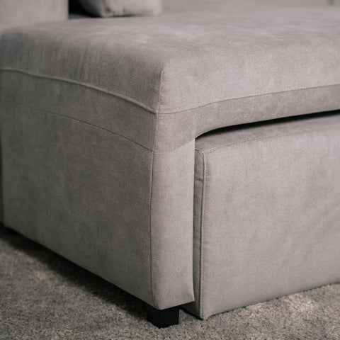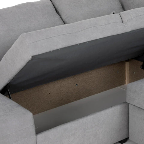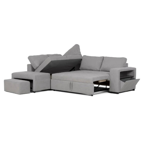 Sofá-cama de canto de 3 lugares com dois pufes adicionais, 2 espaços de arrumação e uma pequena prateleira.