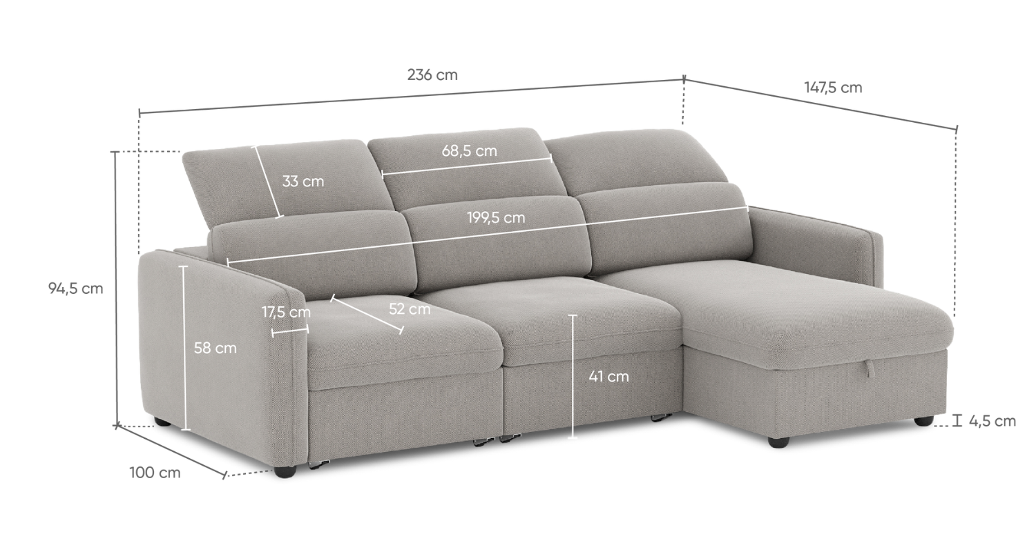 O sistema de abertura por slide permite estender o assento de forma simples e fluida, transformando rapidamente o sofá numa superfície de descanso ampla e confortável. Esta funcionalidade torna o sofá MORGAN ideal para receber visitas ou para criar um espaço adicional de descanso no dia a dia. A arrumação integrada na chaise longue acrescenta uma vertente prática essencial, permitindo organizar mantas, almofadas ou outros objetos de forma discreta.