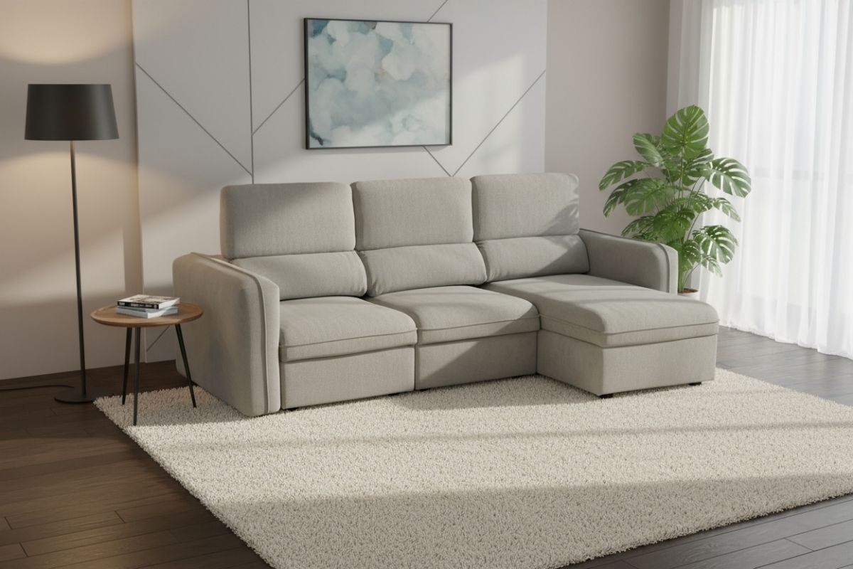 O sofá MORGAN é um sofá cama com arrumação na chaise longue, sistema de abertura por deslizamento e cabeceiras reclináveis, concebido para oferecer um elevado nível de conforto, funcionalidade e ergonomia em ambientes contemporâneos. A sua construção sólida e o design harmonioso conferem-lhe uma presença robusta e acolhedora na sala.