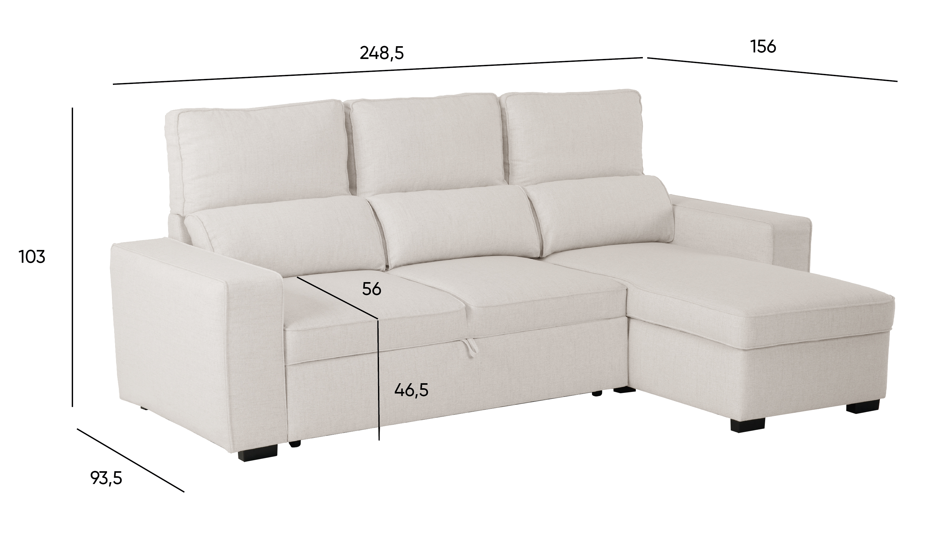 Sofá Cama com Chaise longue reversível com arrumação, Encosto ajustável