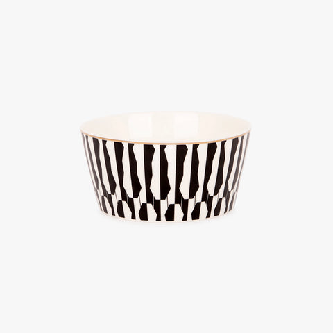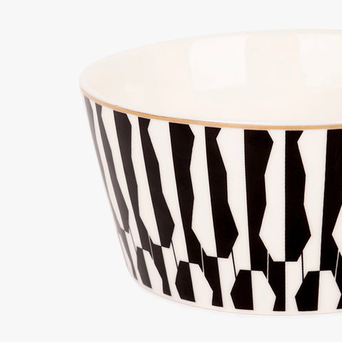 A coleção Black Cat é uma fusão ousada entre a sofisticação urbana e a elegância Art Deco. O seu design joga com contrastes geométricos entre o preto e o branco, positivo e negativo, onde a silhueta de um gato se revela subtilmente, quase escondida, criando um efeito visual intrigante. A paleta restrita, com toques de dourado metálico, reforça o glamour e a modernidade de cada peça. Um serviço de mesa em porcelana, composto por dois pratos marcadores, prato raso, prato de sobremesa, prato de sopa, duas taças, saladeira, e chávenas de chá e café em conjuntos de 2 e de 6 peças.