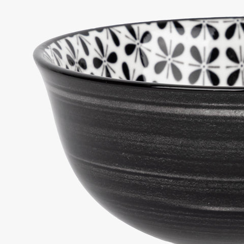 Produzido em Porcelana New Bone China é composto por quatro padrões diferentes nas duas cores Preto e Azul em prato raso, prato de sobremesa, prato de sopa e duas taças.
